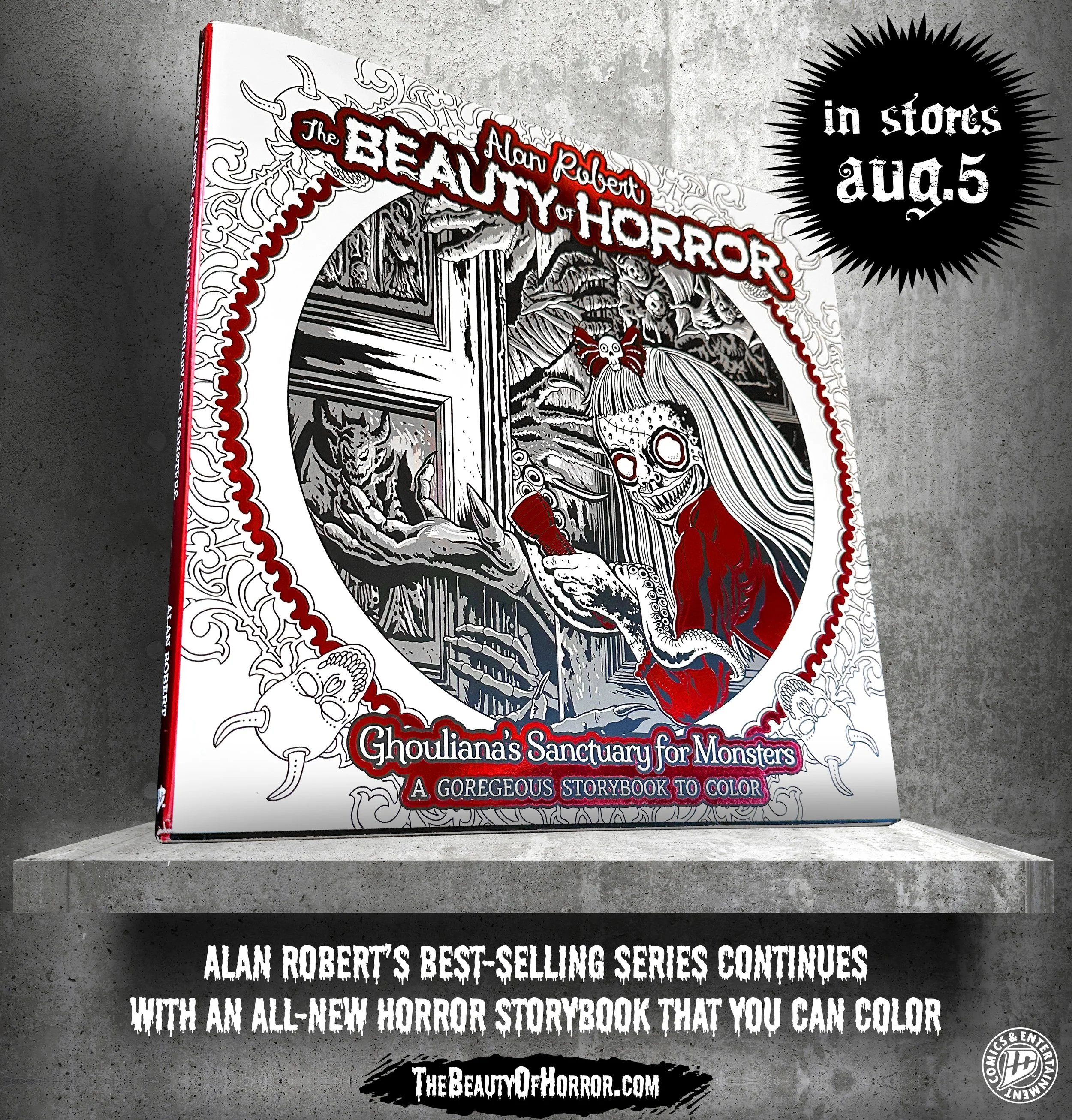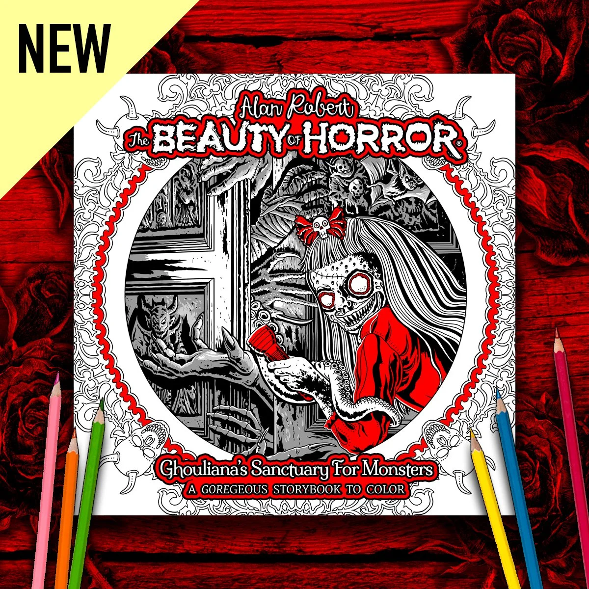 In the latest edition of the bestselling Beauty of Horror coloring book series by famed creator Alan Robert, colorists are not only invited to unleash their creativity over 80 pages of intricate and macabre illustrations, but also to immerse themselves in Ghouliana's world through her first ever illustrated storybook. The journey unfolds as Ghouliana arrives at a secret, underground “Sanctuary For Monsters,” and encounters Agatha, an 18th-century witch dedicated to protecting the world's most feared, supernatural creatures from human malevolence.