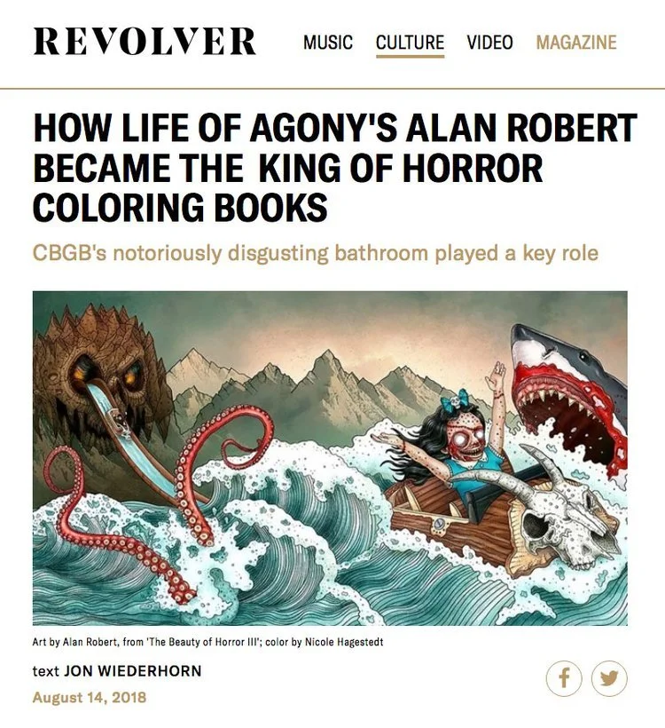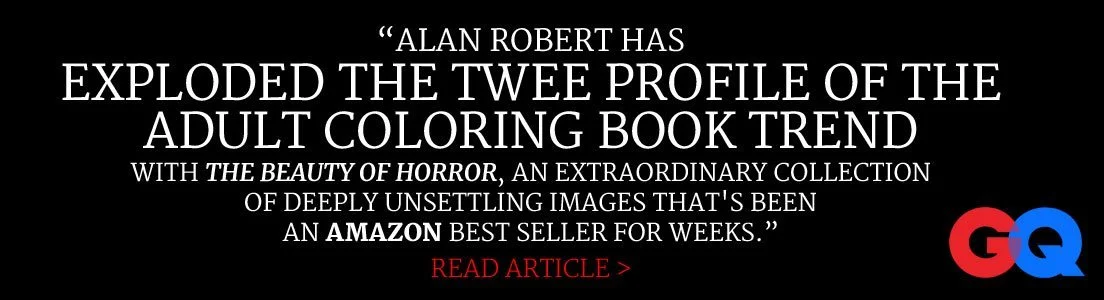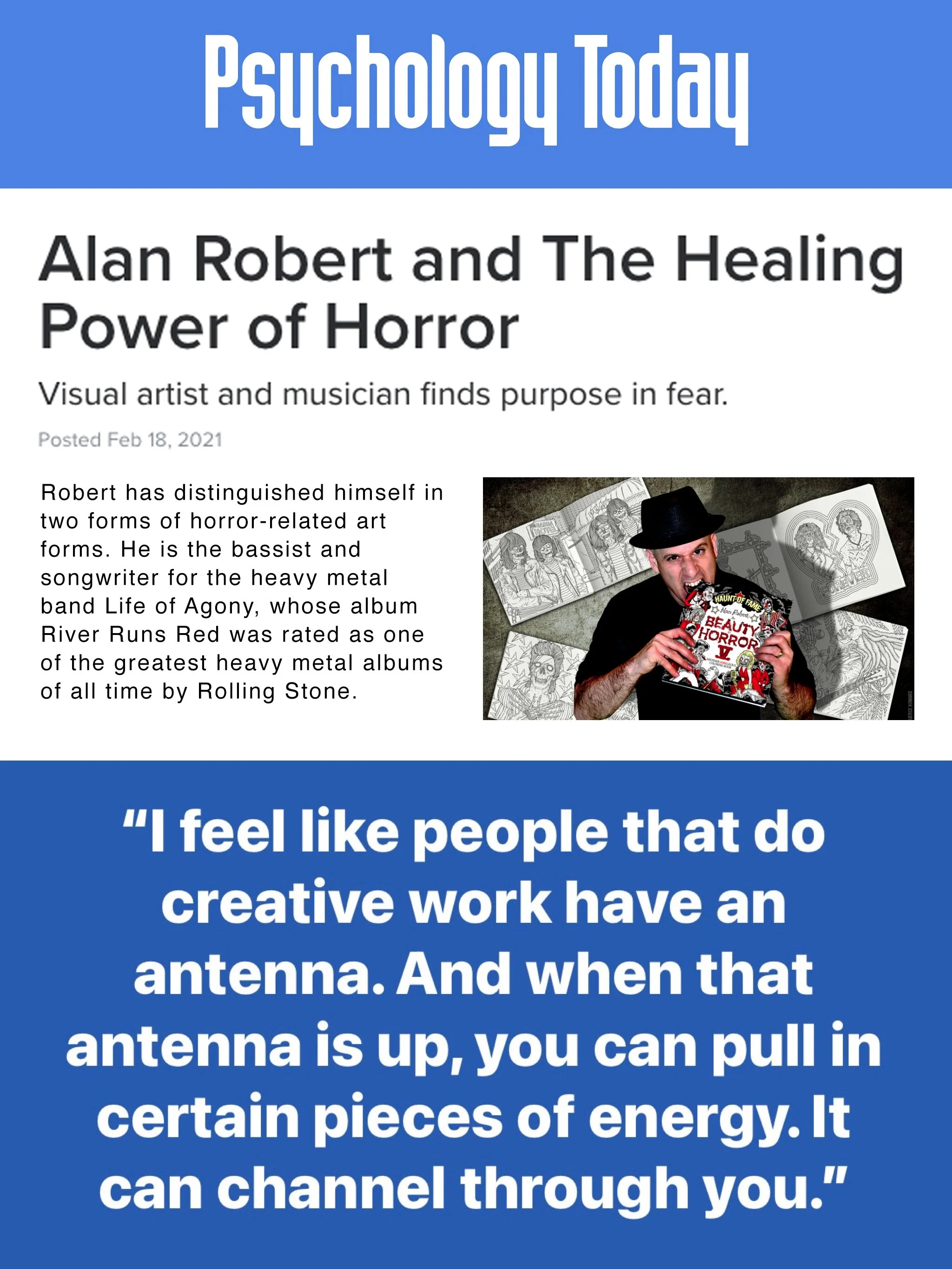 Award-winning author & illustrator Alan Robert (of the hard rock band Life of Agony) created the best-selling coloring book series The Beauty of Horror, hailed by Nerdist as“The World’s Creepiest Coloring Book.” The hit series is published by IDW Publishing and distributed by Penguin Random House. The Beauty of Horror series is comprised of seven volumes of coloring books, Storybooks to color, tarot card sets, journals, holiday specials, colorable jigsaw puzzles, lithographs, and more! The beauty of horror has sold over 700,000 copies to date. A Claymation video promoting the Beauty of Horror holiday book went viral with nearly 8 million views >
