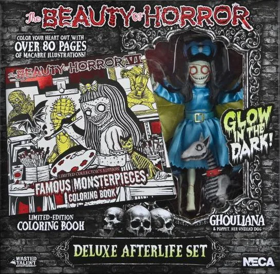From the pages of The Beauty of Horror, the best-selling coloring book series by rock star-turned-comics creator Alan Robert! Everyone’s favorite undead girl is ready to add some color-fueled chaos to your collection as a 6-inch action figure by NECA. Ghouliana comes dressed in vintage-style tailored soft goods clothing and is joined by her loyal undead pup, Poppet. These poseable figures feature eerie glow-in-the-dark details for an extra chilling touch. This Deluxe Afterlife Set comes with a limited collector’s edition coloring book, The Beauty of Horror 6: Famous Monsterpieces, signed by Alan Robert!